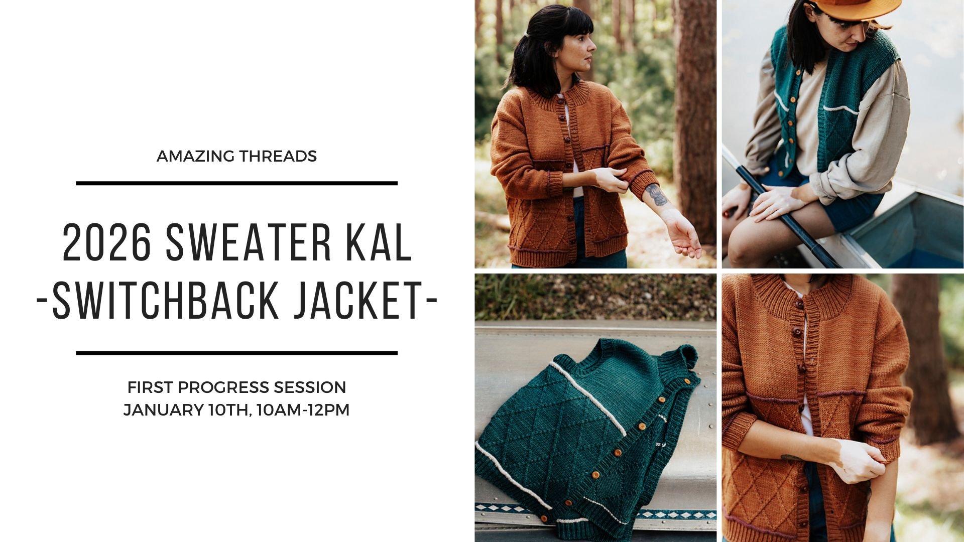 Join the Amazing Threads 2026 Sweater Knit-Along to knit the Switchback Jacket & Vest! Two different designs available (cardigan or vest) to fit your fit and style preferences! Both sweaters are knit from the top down (meaning you can try it on as you go and add length to suit your own personal style!). The pattern includes unique customizable sizing to accommodate both a variety of shoulder and body circumference combinations as well as preferred fit. Note: The Switchback Jacket & Vest is currently available only in Trails & Valleys by Lindsey Fowler