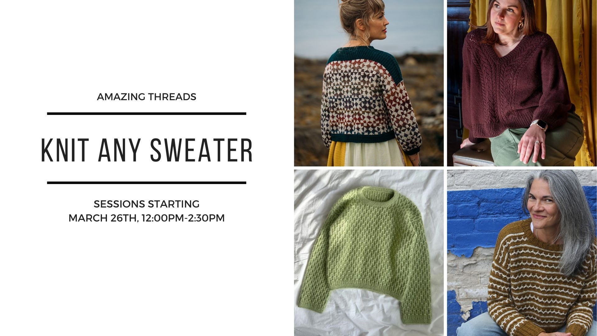 Choose your own adventure! Pick any sweater pattern and join Susan for this four week series.